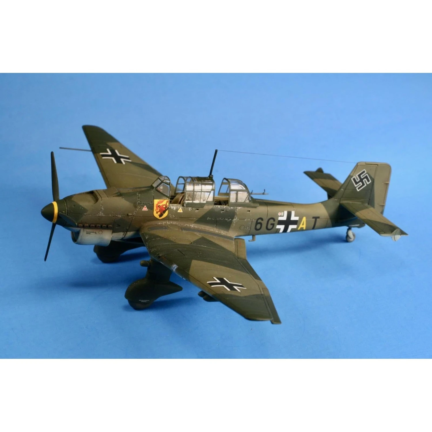 The Junkers Ju87 Stuka quickly became one of the most infamous, and feared weapons of the Second World War. The two-man dive bomber first saw action in the skies over Spain during the Spanish Civil War. While outdated in appearance the Stuka did contain some modern features such as automatic dive brakes but overall the design was outmoded. Over the skies of Poland, France and the Low Countries in 1940 the Stuka was able to operate in clear skies and did so effectively but over the South of England during the Battle of Britain, the Stuka came up against staunch RAF fighter opposition, and suffered as a result. Later the Stuka was used in the Balkans and the Western Desert, and continued to serve Russia, as a tank destroyer, until the end of the Second World War.