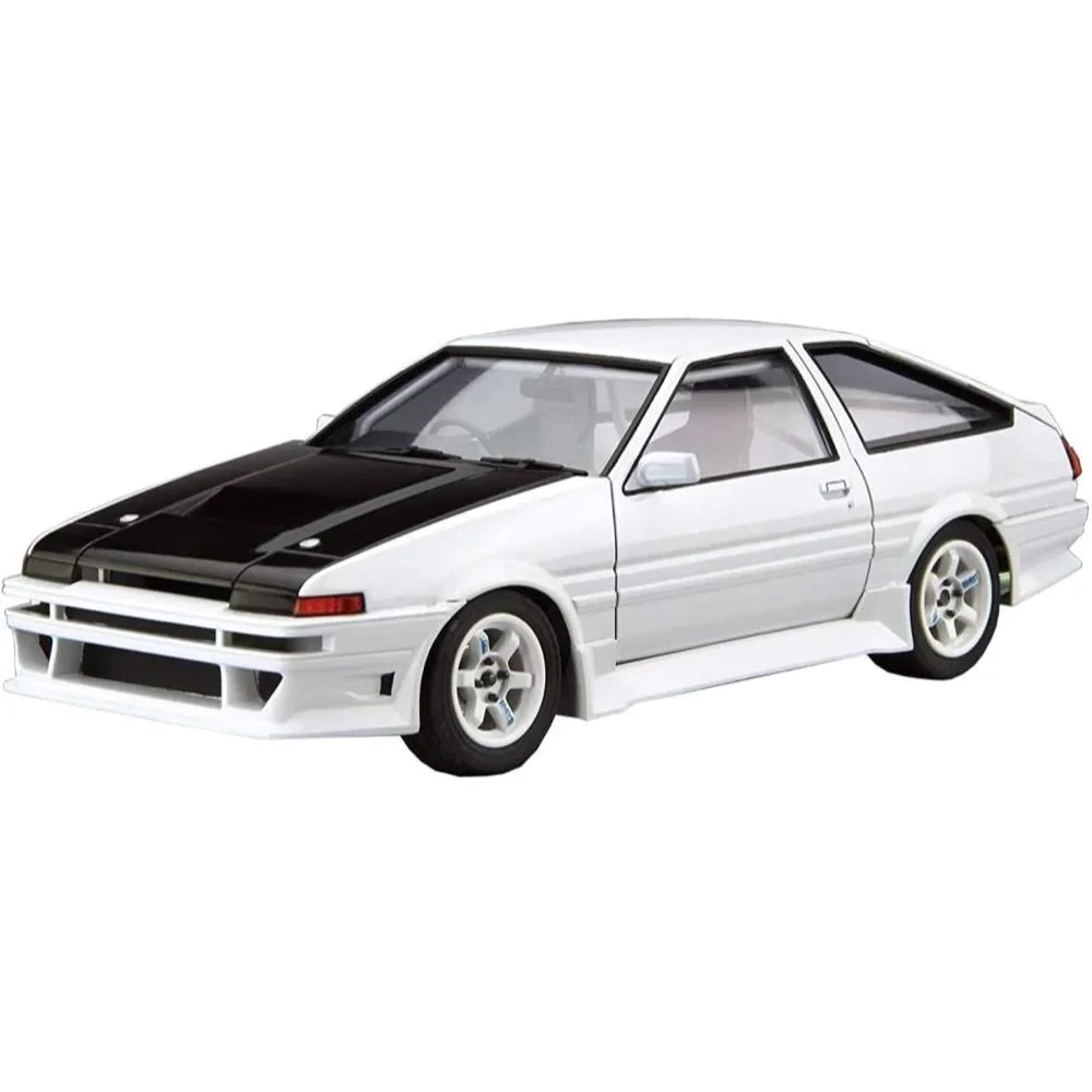 This kit of the Toyota AE86 Trueno from 1985 includes parts to reproduce the front and rear bumper spoilers, sidestep, gutted interior, muffler, racing-style steering wheel, racing bucket seat, roll cage, aero bonnet, and 16-inch TE37 wheels. The retractable headlights do not open or close.