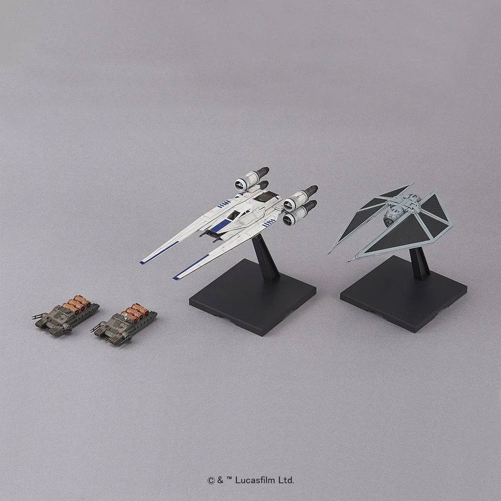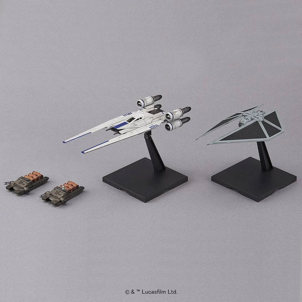 The rebel army’s “U-Wing Fighter” and the Empire’s “TIE Striker” from the new “Rogue One: A Star Wars Story” now come together in this 1/144 plastic model set! The variation of movement in the U-Wing and the TIE Striker’s solar panels have been faithfully recreated. Fine detailing down to the included scale combat assault tanks that appear in the film adds more impact to this set.