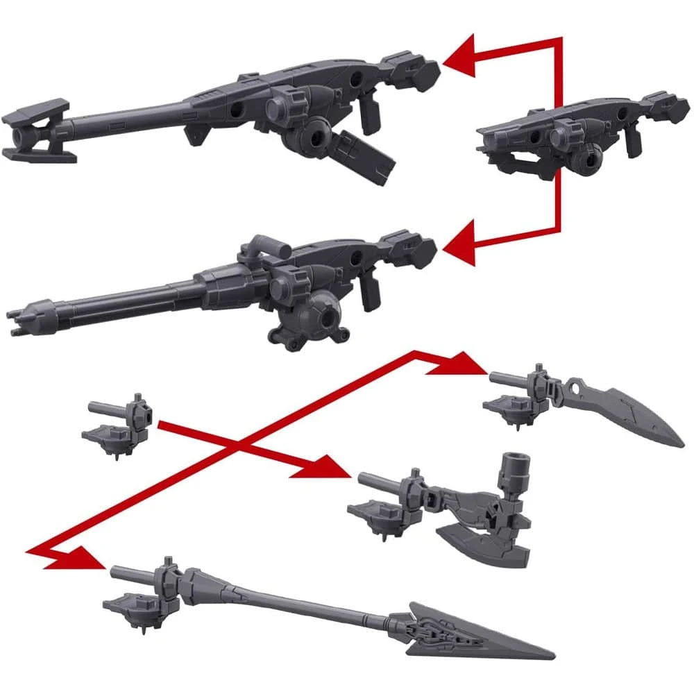 Weapons for the 30 Minutes Mission series! Contains one hilt that can be used to create a Lance, Knife, and Axe and a gun with interchangeable barrels for beam rifle and Gatling gun. Optional weapon suitable for equipment of [bEXM – 15 Portanova] which can be strategically customized based on the core unit is commercialized. Customize weapons and strategies!