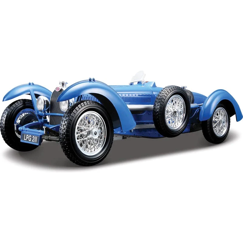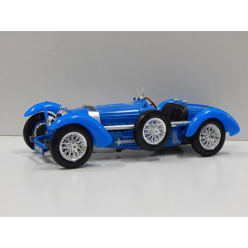 The final Bugatti race car of the 1930s was the Type 59 of 1934. It used an enlarged 3.3 L (3257 cc/198 in³) version of the straight-eight Type 57’s engine sitting in a modified Type 54 chassis. The engine was lowered for a better center of gravity, and the frame was lightened with a number of holes drilled in the chassis. The signature piano wire wheels used splines between the brake drum and rim, and relied on the radial spokes to handle cornering loads. 250 hp (186 kW) was on tap, and eight were made.