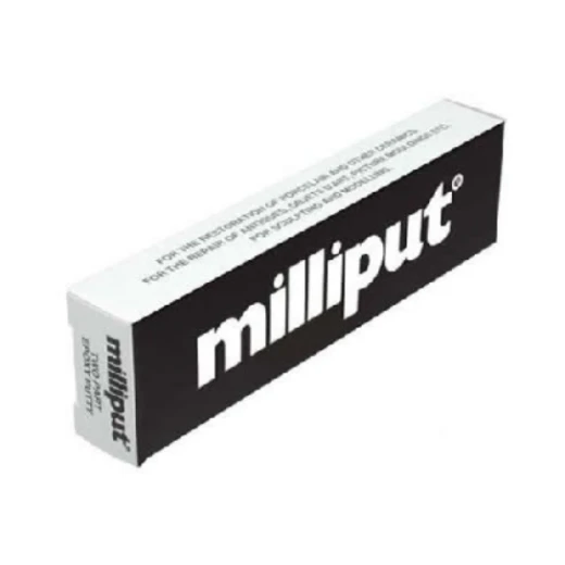 Milliput Black 2-part epoxy putty, consists of 2 x 56.7gm (2 oz) sticks. Long shelf life (approximately 2 years if stored in cool, dry condition), once toughly mixed in equal parts the resultant putty is soft and highly adhesive then gradually hardens. Speed of hardening is dependant on temperature – at normal temperatures (20-25 degrees C) becomes rock hard in 3-4 hours. Putty is fully cured in 6-8 hours at same temperature and can then be machined, drilled, tapped, turned, filed, sawn, sandpapered and painted. Will bond: wood, brick, cement, metals, concrete, plastics, glass etc – not intended as a thin layer adhesive. May cause irritation to sensitive skin; it is advisable to use rubber or polythene gloves when handling non-hardened product.