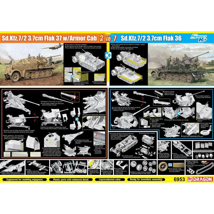 Dragon continues its exciting 2-in-1 series with its focus now turning to the Sd.Kfz.7/2 anti-aircraft halftrack. Original versions of this air defense vehicle had a regular open cab, whereas the armored Sd.Kfz.7/2 version appeared from late 1943 onwards. The weapon also switched from the Flak 36 to the improved Flak 37 in 1944. Dragon’s 2-in-1 kit of these Sd.Kfz.7/2 halftracks provides modelers with either a regular open cab or an armored cab. Furthermore, the kit offers two different types of tailgates/dropsides. Featuring slide-mold technology and photo-etched parts, the halftrack chassis and 3.7cm cannons exhibit an ultimate level of accuracy. This 2-in-1 choice of the Sd.Kfz.7/2 is therefore a convenient solution for the connoisseur who has not yet decided which fascinating German antiaircraft vehicle to build!