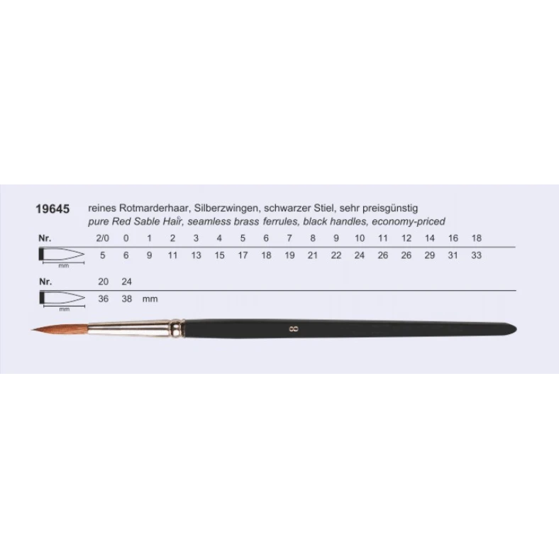 Red Sable Hair, seamless brass ferrules, black handles, economy-priced.