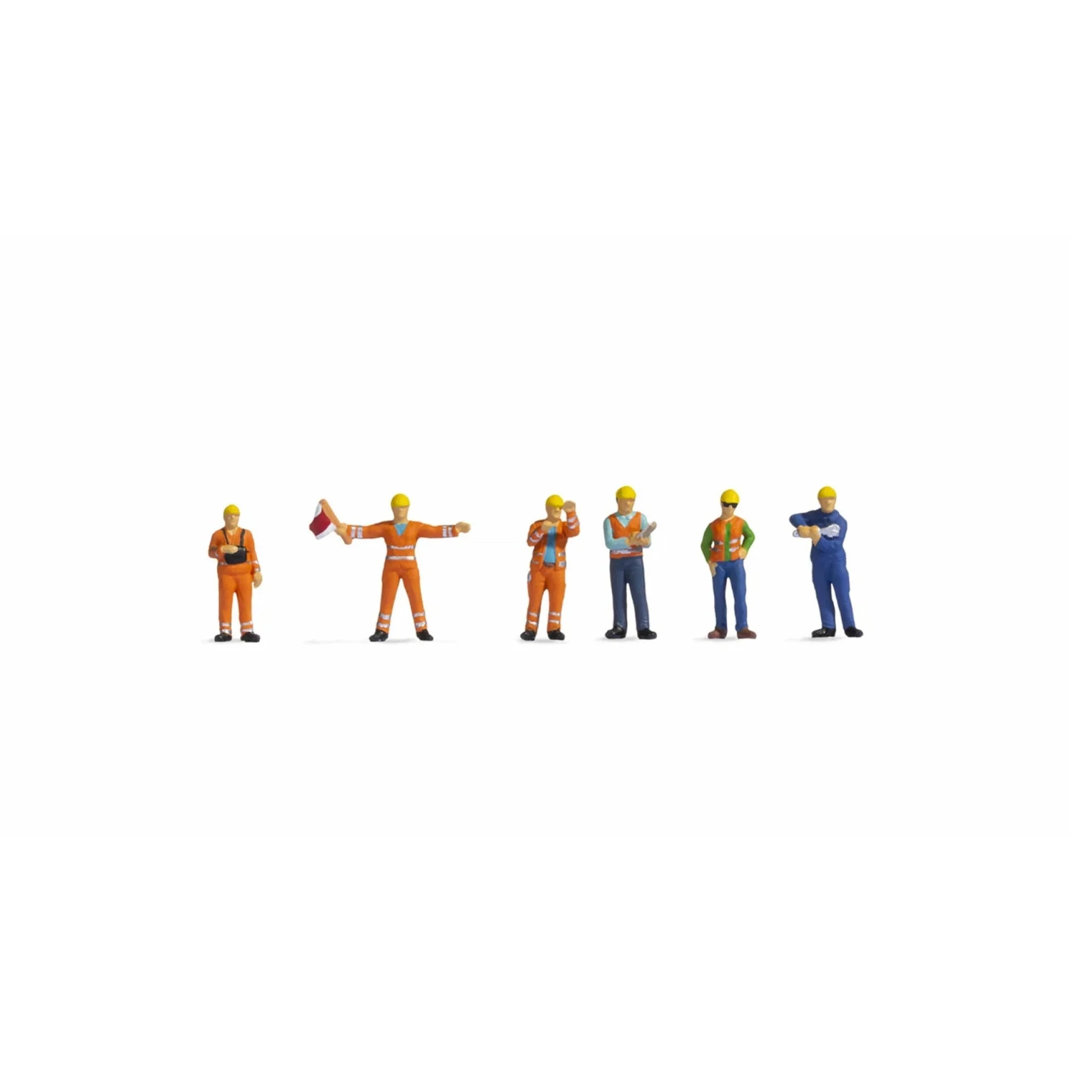 Six figures in work clothes are included in the set. They are all wearing a hard hat and getting on with their work. A man is holding a flag in his right hand and is stretching his arms out to the side to warn the passengers. Another man is noting something in his notepad, which he has attached to a clipboard. Two other men are holding tools in their hands, while a woman wearing protective goggles checks on the work that has been done. Also included is a man who is giving his colleagues a hand signal with further work instructions.