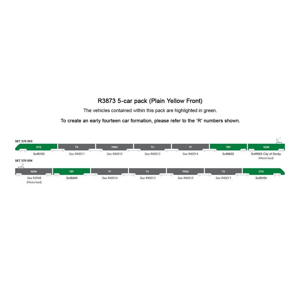 British Rail Class 370 Advanced Passenger Train 5-car Pack Set 370 003 comprising DTS Sc48103, TBF Sc48603 and NDM Sc49003 City of Derby, along with Set 370 004 comprising TBF Sc48604 and DTS Sc48104. By the end of 1970 the British Rail Board began considering the third design phase of the Advanced Passenger Train; the prototype for the full production trains that would incorporate the technology of the APT-E in a practical application.