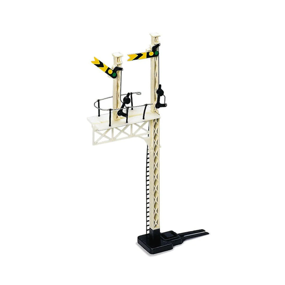 Represents the type of signal used on the approach to points. The taller signal controls the main line. The yellow arms signify ‘distant’ or ‘caution’, and are seen prior to signals with red arms. Hornby is a household name and is famous as the UK’s brand leader in the model railway hobby with its high quality 00 gauge (1:76) models and accessories.