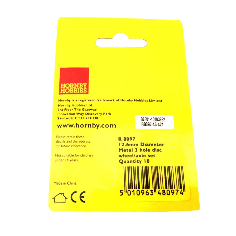 These Hornby R8097 Metal Disc Wheels and axles are direct replacements for those fitted to many Hornby locomotives, passenger coaches, trucks and wagons over the years. These wheels have solid discs with 3 holes. Hornby is a household name and is famous as the UK’s brand leader in the model railway hobby with its high quality 00 gauge (1:76) models and accessories. A must have for railway modellers and enthusiast and a great addition to your collection or landscape models.