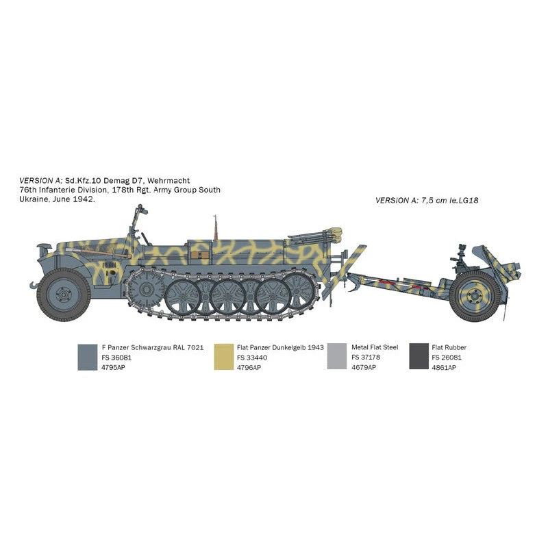 The Sd.Kfz 10 Demag D7 half-track tractor was used by the German troops in large numbers during the Second World War on all the main fronts from the invasion of Poland, to North Africa, to Russia. It was designed and developed to be an effective prime mover for small towed artillery as anti-aircraft and anti-tank guns. The Demag D7 could carry eight fully equipped soldiers in addition to towing a gun or a trailer. The 4.2-liter Maybach 6-cylinder engine, positioned in the front of the vehicle, could deliver 99 hp. Thanks to its engine the half-track was able to reach a max speed of 65 km/h and to have a good on-road and off-road performance. The vehicle was reliable and flexible and it was produced in an important number of units and in several versions The light howitzer Le. IG 18 was designed to provide artillery support within infantry companies. Reliable and accurate, towed by DEMAG or Protze tractors, it was often replaced during the war by more powerful and lighter mortars.