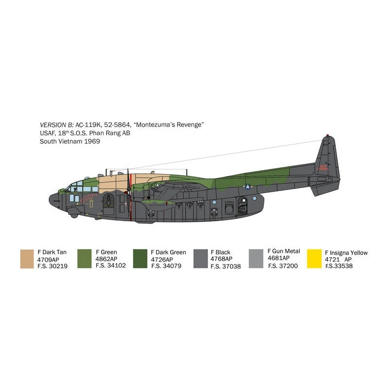 The heavy transport-plane Fairchild C-119 served the US-Air Force as a basis for a conversion to a «flying gunship»,. This special construction was especially used in Vietnam for night missions against Vietcong supply lines and troop concentrations. The version AC-119 K was especially effective against truck due to its two 20mm guns and four 7,62mm mini-guns. A further version, the AC-119 G, had lighter armament. Two additional jet engines were mounted to enable the plane to take off from short runways fully loaded with ammunition. With the entry into service of the more powerful AC-130H these aircraft were progressively handed over to the South Vietnamese air force which used them until the fall of the Saigon government.