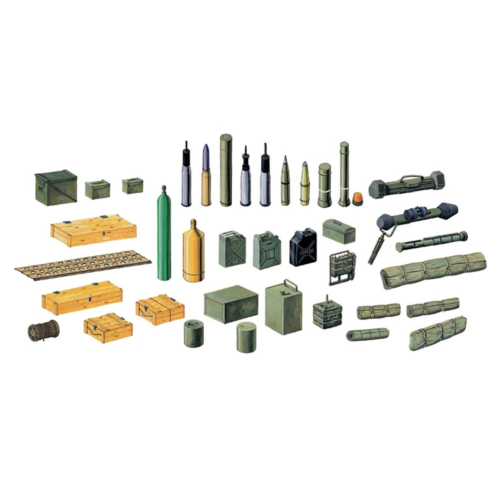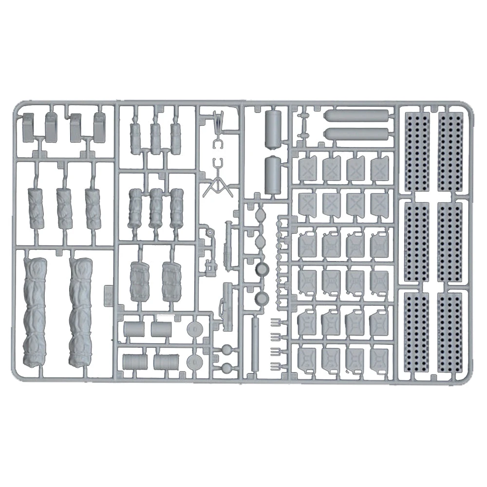 – Items including water cans, ammo crates, blanket rolls, fuel cans, armament, tool box and more