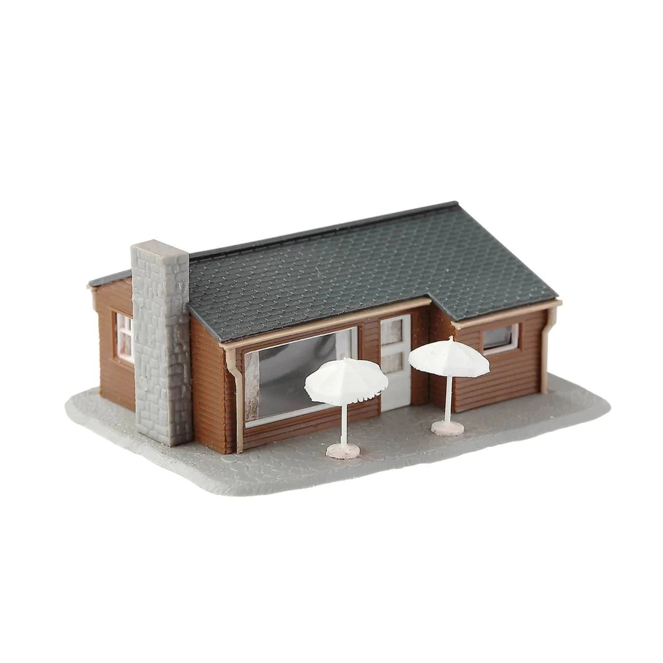 Typical modern small bungalow with simulated cedar wood walls. Small dwellings like these are often part of a housing development. Easily assembled with or without the supplied base.