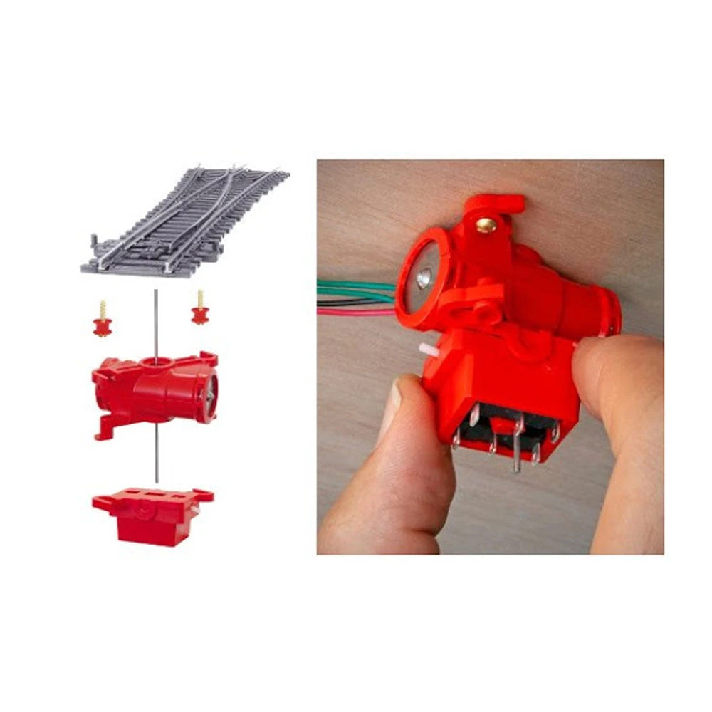 Each motor is supplied with a template, which the modeller uses to accurately mark the position of three holes that need to be drilled. The two outer holes are used to attach mounting studs beneath the baseboard. The larger centre hole is where the drive pin of the motor is positioned and threaded through the tie bar of the turnout. The motor is then simply twisted, and locked, into position and will remain firmly attached when operated. An extra operating bar, and spacers for the studs is included with every motor, enabling the above-board mounting of the motor where needed.