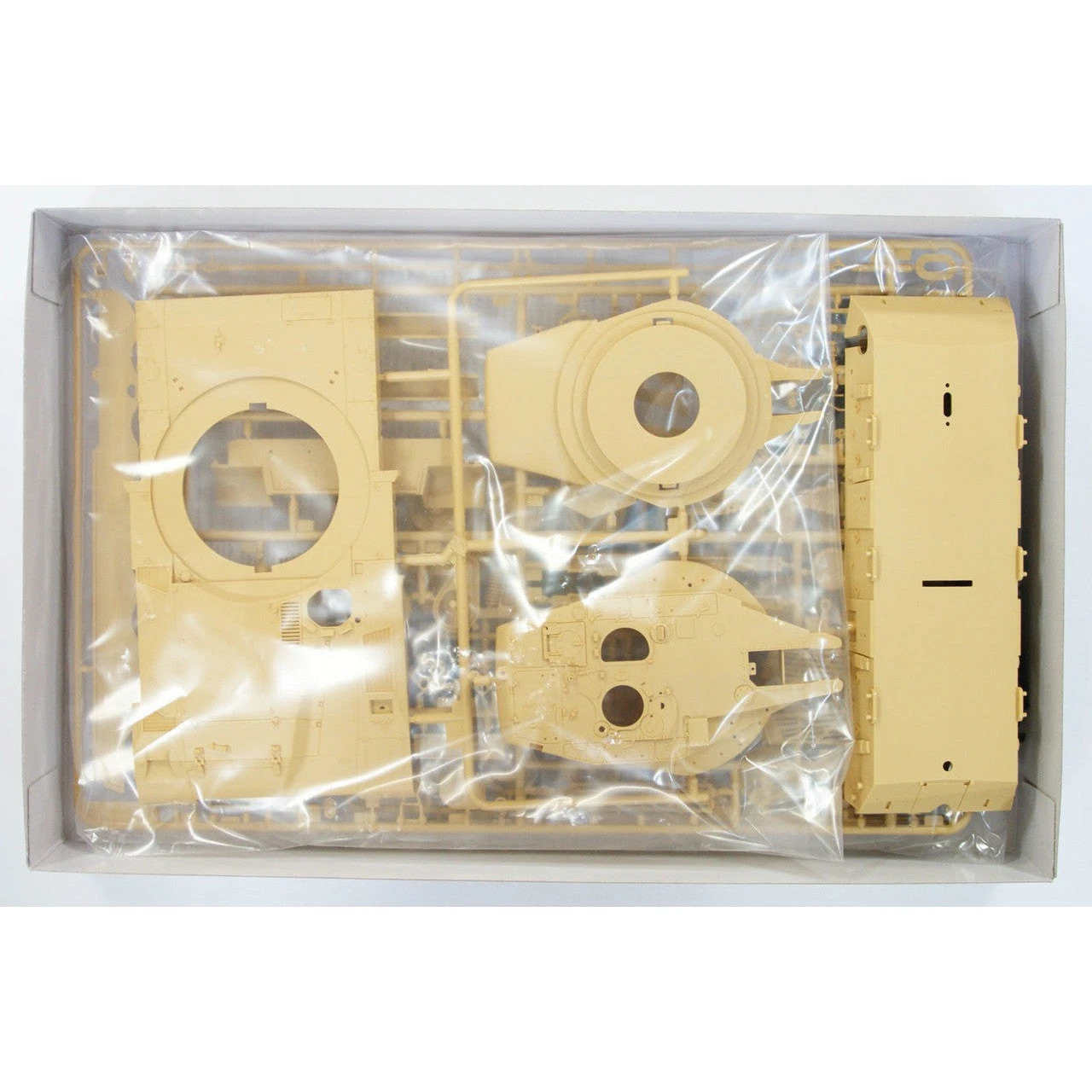 The Merkava is manned by a crew of four and its main armament is the 105mm M64 L71A tank gun, with a secondary armament of a 7.62mm co-axial machine gun located in a vertical armoured slit in the turret and two additional LMG’s on the commander’s hath and the loaders hatch, these are used for close in combat and against low-flying aircraft. The driver is located to the left of the power pack and can enter the rear compartment by lowering his seat back. The fighting compartment extends the whole width of the hull and is air-conditioned for crew comfort in the desert environments it was designed to operate in. The engine is a Teledyne Continental AVDS-1790 V-12 Diesel which produces 900hp.
