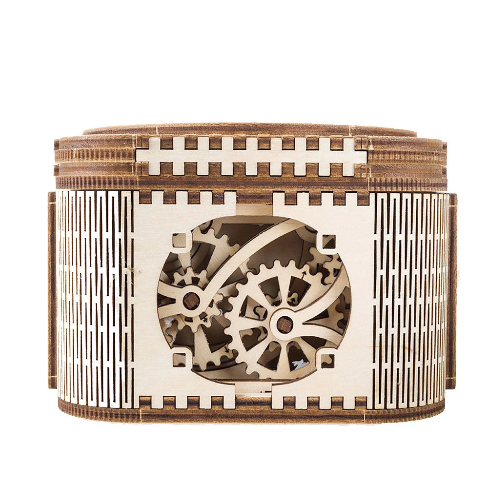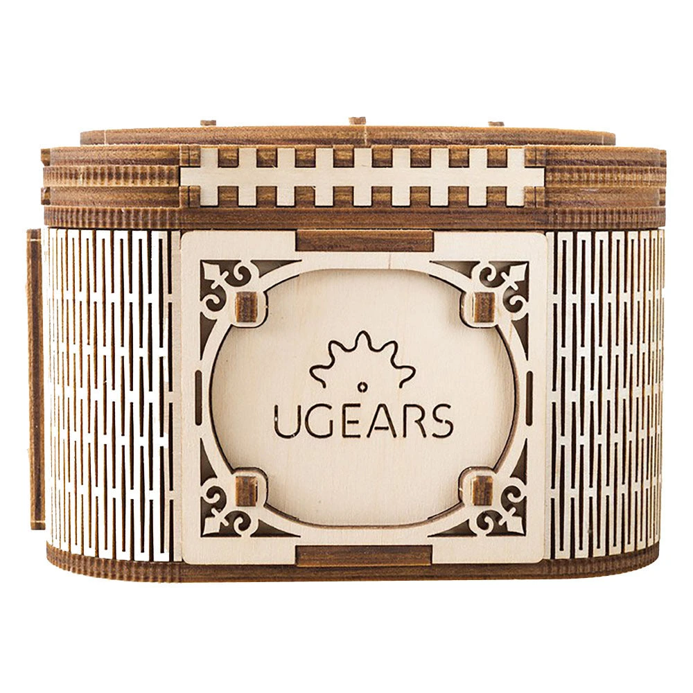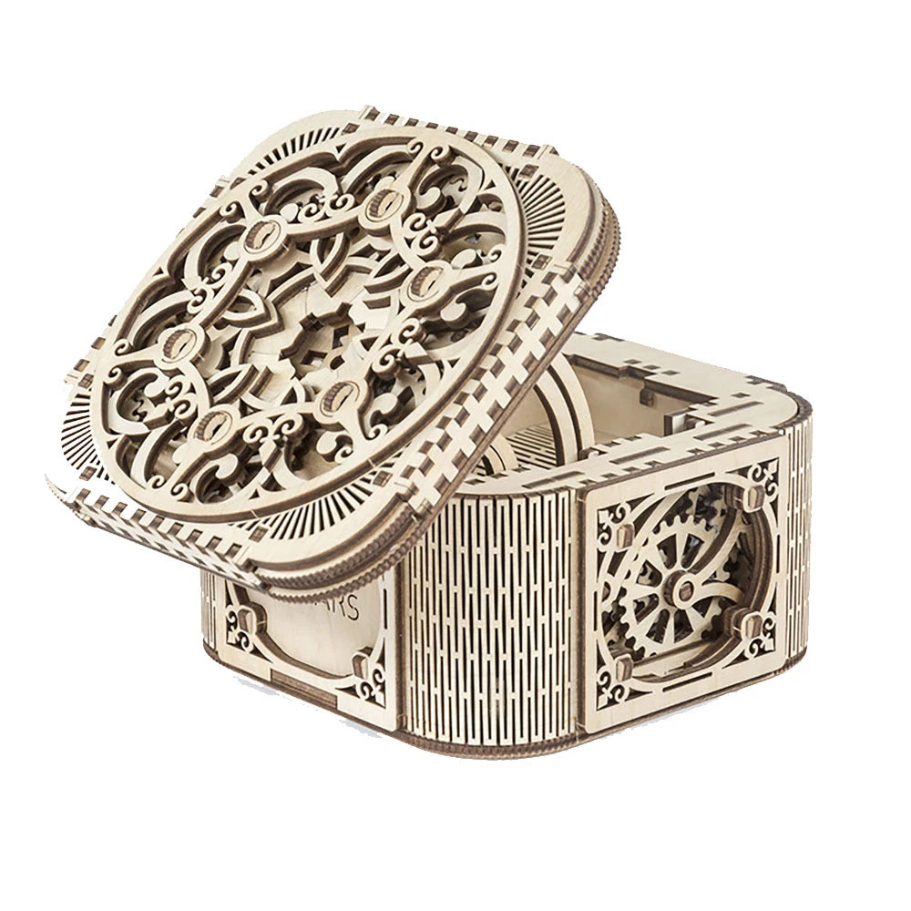 An exquisite Mechanical Puzzle Box for jewelry and notes. The true jewel of Ugears collection of wooden models. The delicate through-carved work of its lid and sides invites you to gain a glimpse into the mystery that the moving gears conceal. Although only the one who can solve the secrets of the puzzle box will get to enjoy the treasure of beautiful mechanics in its action. One would imagine that in order to open the box, we’d need a key – and the key is right there, beautifully embedded in the carved lid. All you need to do to take it out is to slightly turn the key clockwise. Although, getting the key is only a part of the puzzle. To set the gears in motion, before taking the key out, you need to unblock the mechanism that lifts the lid by turning the key counter-clockwise. When all the secrets are revealed and the box is opened, inside you will find a small compartment for jewelry, notes, and other small items. You may be sure, your treasures and secrets are safe with the new Ugears Treasure Box.