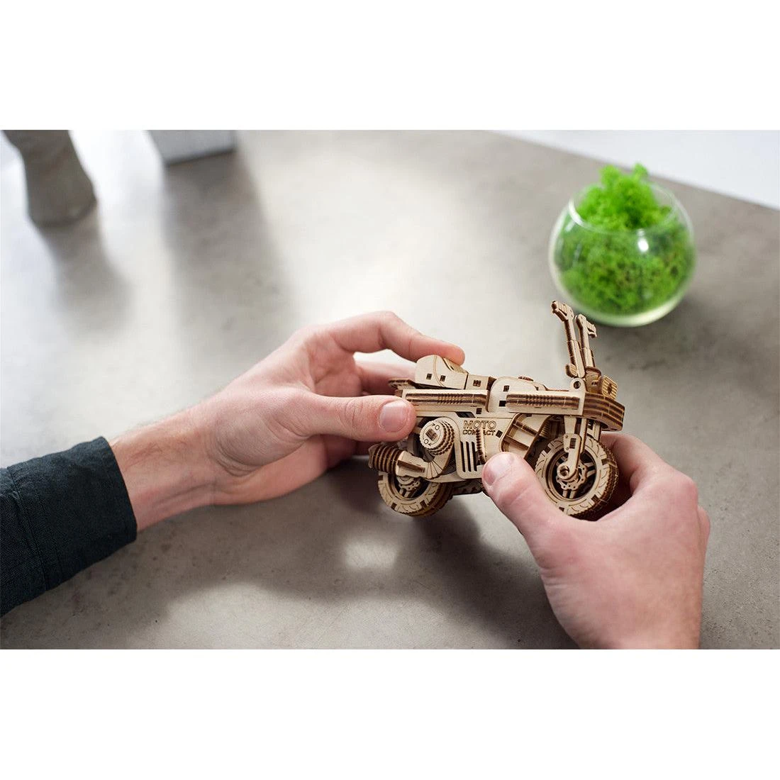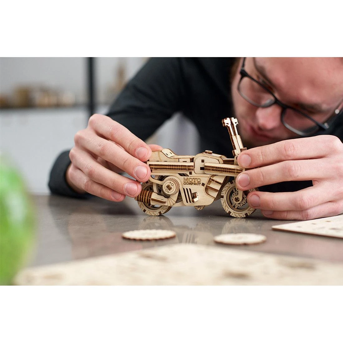 The Moto Compact folding scooter 3D puzzle packs quite a bit of power for its size. The wooden model scooter is driven by a spring-loaded engine, and is able to travel 2 m (six feet) on a single wind-up. The handle bars can be placed in one of three positions to send your Moto on a straight course, or curving to the left or right. Because this is a Ugears model, and because we delight in packing as much mechanical action as we can into our wooden DIY models, the Moto Compact comes loaded with great features, including front and rear suspension, and sophisticated folding capability for safe and easy transport.