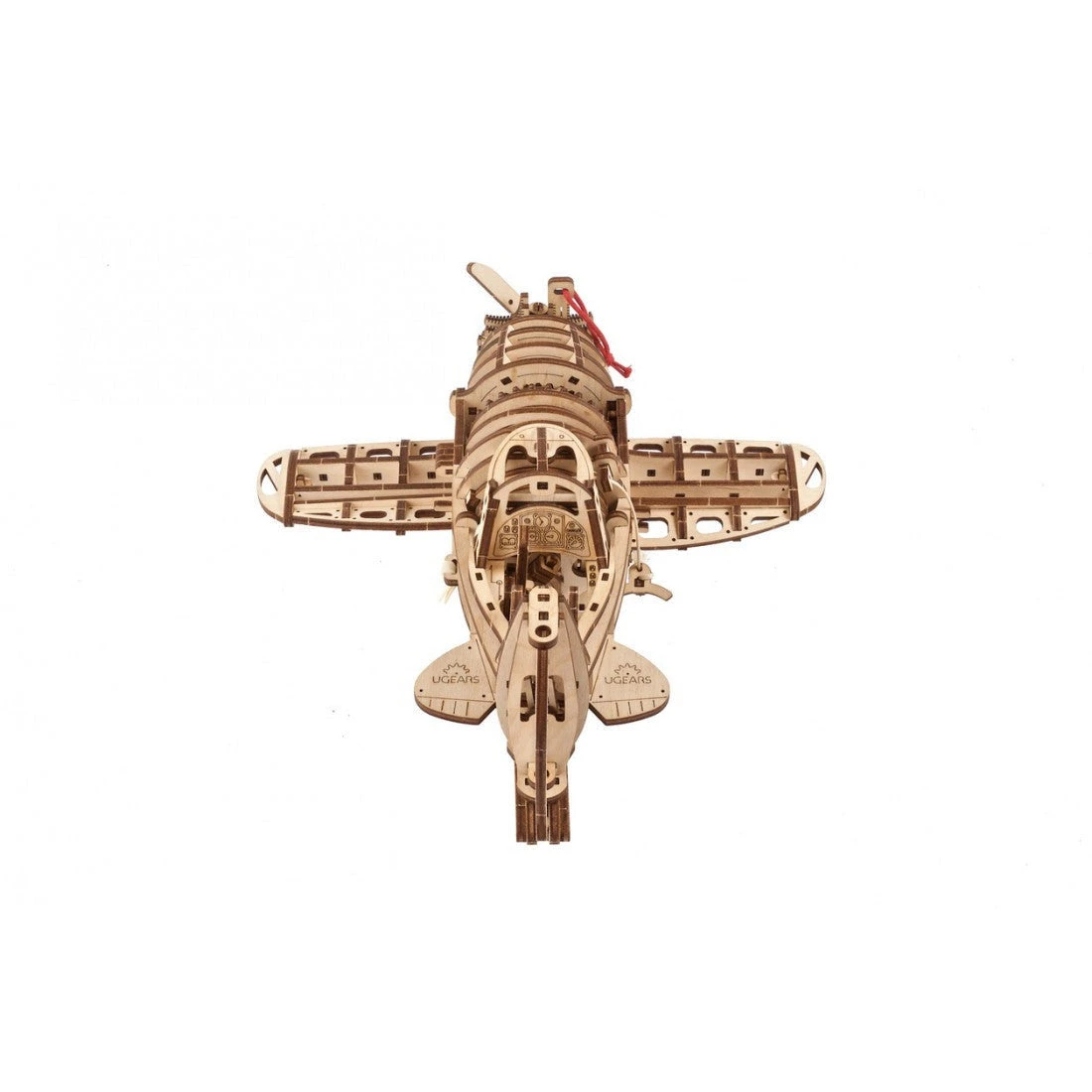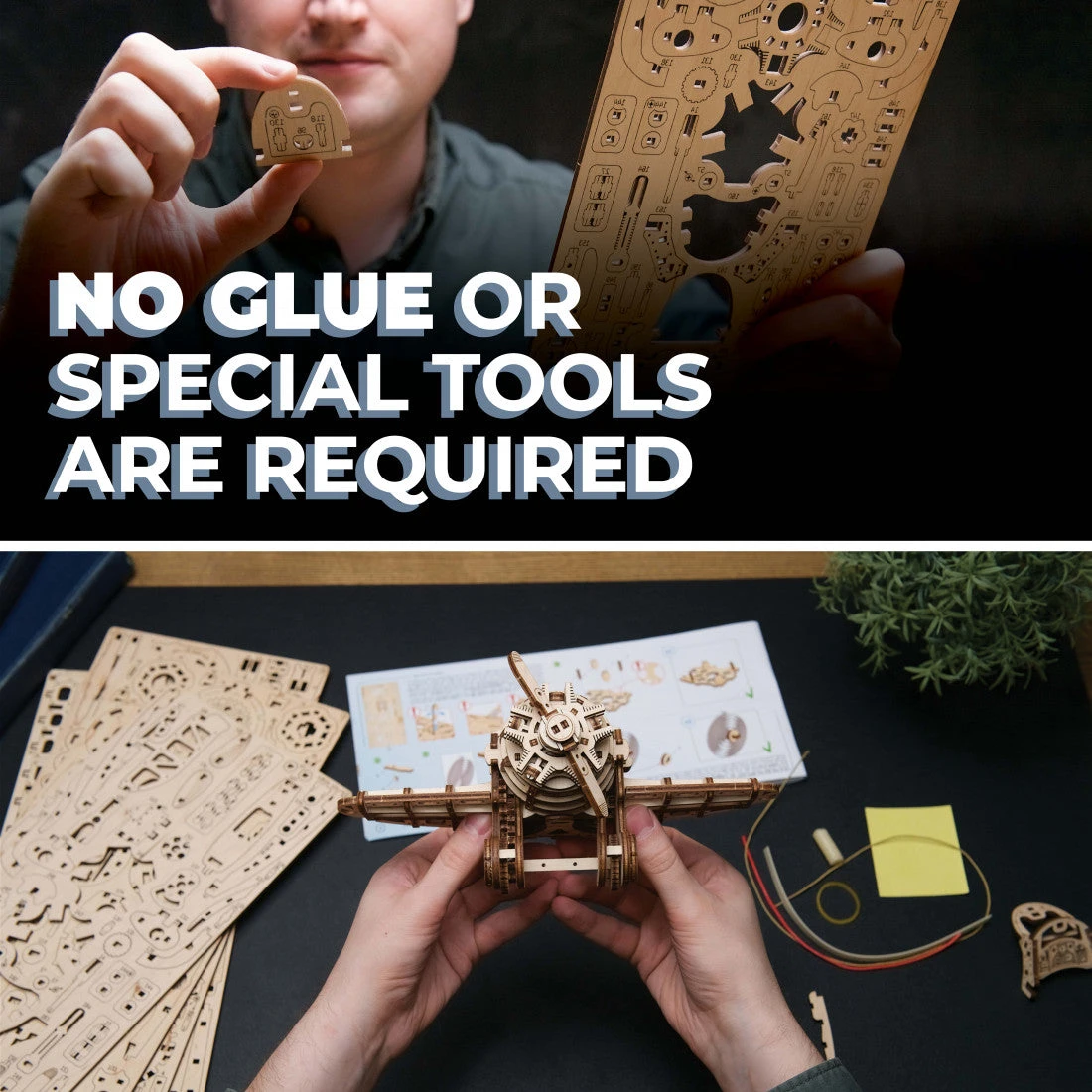 No glue or special tools are required to assemble this DIY model kit, just punch the pre-cut pieces out of their composite wood boards and snap them together. When assembling your Mad Hornet Airplane model, remember to lightly sand and wax the moving parts to make them run smoothly. This is a “Medium” difficulty model so meant for somewhat experienced modelers or those up for a challenge. The model kit includes detailed, illustrated instructions in 11 languages (Ukrainian, English, German, Spanish, French, Italian, Portuguese, Polish, Japanese, Chinese, and Korean) to guide your assembly. If you’re not yet familiar with the Ugears catalogue of 3D puzzles, DIY model kits, automatons, robots, wooden puzzle boxes and STEM Lab models you could order one of our simpler models together with the Mad Hornet as a warm-up build.