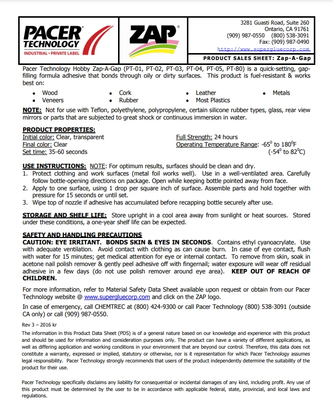 Fills gaps. Works well on harder woods such as bass and spruce, even works on oily surfaces! Some uses besides hobbies and crafts include; jewelry manufacturing and repair, taxidermy, pool cue tips, darts, archery, knife making, mold and pattern making, furniture refinishing and antique repair, and for fishing, fly line splicing and fly tying. Wood turners and manufacturers of custom wood products appreciate the ability of ZAP-A-GAP CA+ to help save their projects by filling in and bonding cracks that often occur in expensive hard woods. Allows 7 to 10 seconds for positioning. Accelerate the cure with CA Kicker/Accelerator.